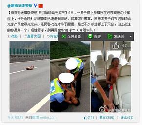 地球这一端,怀化麻阳,据@湖南高速警察爆料:9日,一男子裸上身横卧在包茂高速的快车道上,警察蜀黎迅速赶到现场,将其强行带离。原来该男子前夜因赌球输光家产而生寻死念头,经民警劝说才终于醒悟。