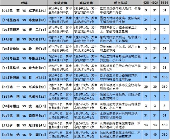 巴西作为最大的夺冠热门,友谊赛最终以9连胜收尾,状态相当恐怖,克罗地算是欧洲准豪门球队,但实力的确和巴西还有一定的差距,本场比赛巴西势必要以3分为准,但历届大赛的揭幕战都非常难打,加上目前亚盘数据对巴西大胜持严重的怀疑态度,桑巴军团还是需要冷眼相看。至于墨西哥和喀麦隆交战,两队的状态都呈现出下滑的趋势,但论及世界大赛的表现还是墨西哥更有优势,可适当高看一线。