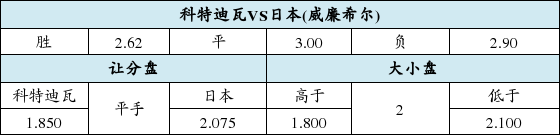 但在赛前赔率方面,科特迪瓦胜赔2.62,而日本胜赔3.00,两队不相上下。盘口中,科特迪瓦没能成功让球,仅仅开出一个平手盘口,毫无优势可言。这对于非洲劲旅是一种“怠慢”,也是对日本实力的一种肯定。