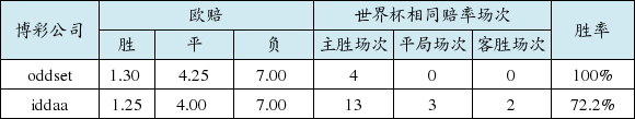 相同赔率一定要挑赔率开出后极少变动的博彩公司来参考,且同赔下的参考场次最好都属于同一赛事。本场阿-波对决,oddset(德国)开出1.30 4.25 7.00的赔率组合,该相同赔率下的世界杯场次历史赛果为4场比赛低赔方全胜,胜率100%。另一家土耳其博彩公司iddaa开出1.25 4.00 7.00的赔率组合,同赔下十几倍场次历史赛果为13胜3平2负,胜率72%。