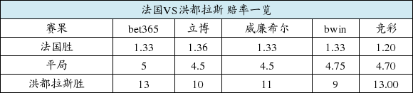 赔率:法国受超低水示好 洪都拉斯在劫难逃