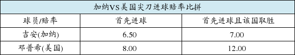 10年南非世界杯正是吉安的加时绝杀将加纳带入八强,如今他依旧是阵中的核心尖刀。博彩公司为加纳尖刀开出首个进球球员赔率为1赔6.5,为双方所有球员中最低。同时,吉安打入首粒进球且加纳获胜的赔率为1赔7,其他首粒进球球员且该国获胜组合的赔率全部在两位数以上。