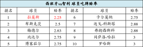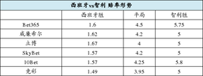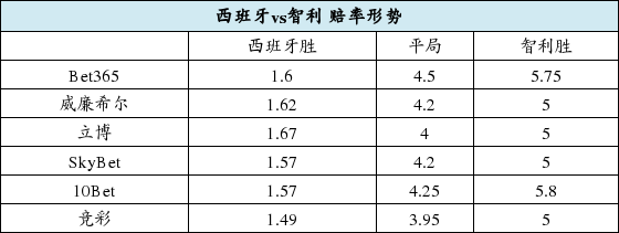 西班牙第一场就被荷兰5比1打个措手不及,不仅积分榜一无所获,4个净负球也成为沉重负担。不过智利即便首战3比1轻取澳大利亚,竞彩和bet365、立博等仍没有给予足够示好。西班牙的胜赔目前只有1.49至1.67,智利的胜赔则普遍在1赔5.0以上,大牌云集的西班牙还是得到了高看。[投注:西班牙胜赔1.42][充20元送50元]