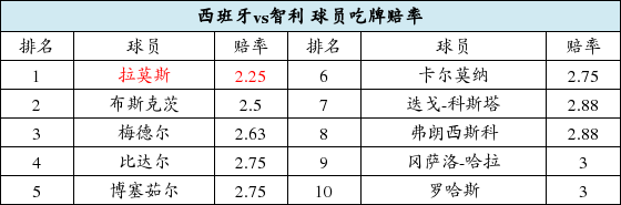 北京时间6月19日凌晨3点,西班牙迎战智利。西班牙首战溃败挖下“大坑”,本场将是出线与否的关键战。立博将西班牙水位抬升,斗牛士军团在这场大战里,依旧存在不小的冷意。而拉莫斯吃牌的赔率只有2.25,“水爷”被相当看好向佩佩[微博]“致敬”。