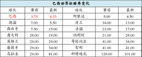 而在今天凌晨的一场闷平过后,形势却发生了较大变化。三队赔率由3.75-4.50-5.50变为4.33-4.50-5.50,巴西对阿根廷优势几乎荡然无存。从世界杯开始前赔率遥遥领先,到现在榜首位置岌岌可危,难道巴西真能忍受死敌阿根廷在自己的主场庆祝夺冠?(文刀刀)