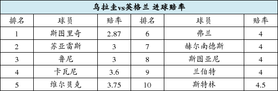 北京时间6月20日凌晨3点,英格兰和乌拉圭狭路相逢。本场竞彩开出3-3-2赔率组合,预示了比赛会相当激烈。而进球赔率方面,“死神”斯图里奇的进球赔率只有2.87,以微弱优势领先他的利物浦队友苏亚雷斯。