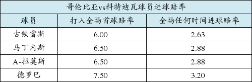 上轮为球队打入第2粒进球的哥伦比亚前锋古铁雷斯此役继续首发的可能性很大,他打入全场首个进球的赔率为1赔6.0最低,全场任何时间取得进球的赔率为2.63同样最低。上轮替补出场没取得进球的马丁内斯打入全场首球的赔率为6.5,任何时间进球赔率为2.88;更有甚者,首轮并未出场的哥伦比亚替补前锋阿德里安-拉莫斯上述两项的赔率也同为6.5和2.88。两个替补打入全场首球和任何时间的赔率均低于魔兽德罗巴。非洲刘德华老矣,不知尚能战否?