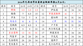 托马斯-穆勒首战戴帽后就一直霸占金靴榜头名。两连胜的荷兰人也很抢眼,罗本和范佩西分列第3和第5,中间夹着次战遭遇“新世纪扑救”的内马尔。