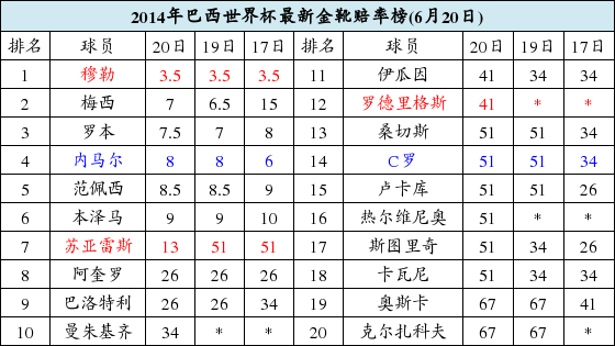6月20日凌晨乌拉圭2-1力克英格兰,复出的苏亚雷斯梅开二度。bet365开出的最新金靴赔率中,穆勒继续以1比3.5领跑,梅西和罗本分列二、三位。苏亚雷斯凭借着本场两粒进球一路狂飙,金靴赔率已由原来的1赔51急剧降至1赔13,排名也升至第7。