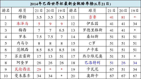 6月21日凌晨结束的世界杯E组小组赛中,法国5-2狂胜瑞士。法国当家球星本泽马打入一球,本届赛事已打入三球追平穆勒、罗本与范佩西。bet365开出的最新金靴赔率中,穆勒继续以1比3.5领跑,本泽马则强势超越梅西内马尔排名第2。