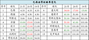 荷兰下滑一位排在第五。智利在赔率由1赔23降到1赔21之后甩开比利时,独自排名第6.比利时、哥伦比亚分列第七和第八。