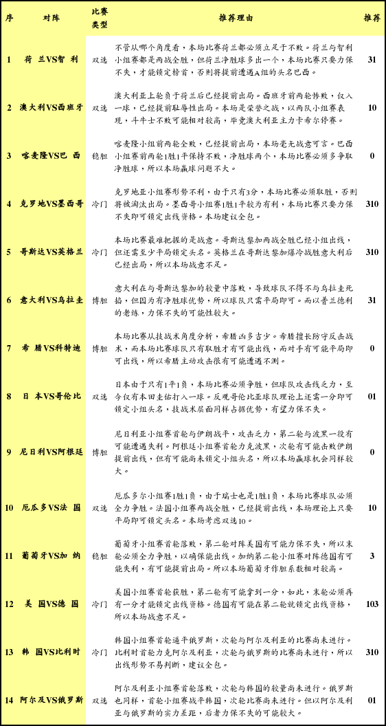 本期足彩投注策略:虽然第二轮小组赛尚未结束,但出线形势已经大体清晰,所以有利于我们的判断。荷兰与智利都是两战全胜,末轮不过是头名之争,荷兰因为净胜球优势,只需力保不失即可,在这种情况下,以荷兰本届杯赛的精明技战术选择,智利很难攻破对手大门,所以可以双选31。澳大利亚与西班牙都已经出局,本场不过是荣誉之战,斗牛士整体表现欠佳,本场比赛不排除再爆冷的可能,不过澳大利亚主力卡希尔停赛,双选10应足够。