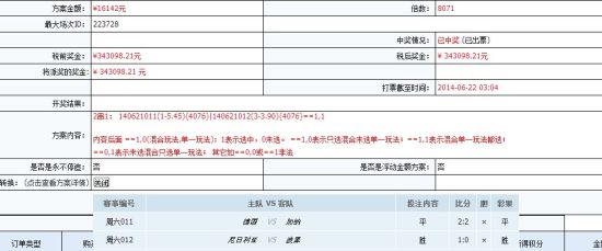 最终德国艰难逼平加纳,波黑输球遭淘汰,比赛结果出乎大部分球迷意料,却正中这位神网友下怀。两场结果的SP值分别为5.45和3.90,最终他投注16142元,一共揽下343,098元奖金。看准结果倍投8000多倍,这位网友的功力实在令人叹服。[投注世界杯:冷门=高回报][买彩就送88元]