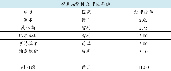 本届世界杯,智利的状态可谓上佳,本场和荷兰的对话鹿死谁手也难下定论。赛前,博彩公司开出了进球赔率,罗本毫无争议的占据榜首,其身后便是智利当家球星桑切斯,而后是巴尔加斯。这样进球榜前三里面就有两名智力球员,而且他们之间的进球赔率也没有多少差距。