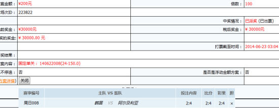 中奖单显示,一位网友在固定过关玩法中单挑了韩国2:4的比分,并倍投了100倍。