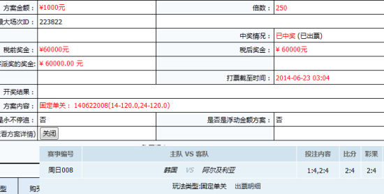 同样也是在固定过关玩法中,另一位网友也预测中了韩国惨败。不过他对比分进行了双选,用1:4和2:4作为双保险倍投250倍。