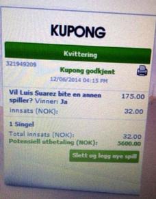 猜中这样奇葩事件的牛人还不止一位。另一位挪威网友同样凭借苏牙咬人,赚了个瓢满钵满。这位网友总共投注了32元挪威币,最后得到5600元。如此神奇的体验,让他兴奋的在社交网络上大晒奖单。