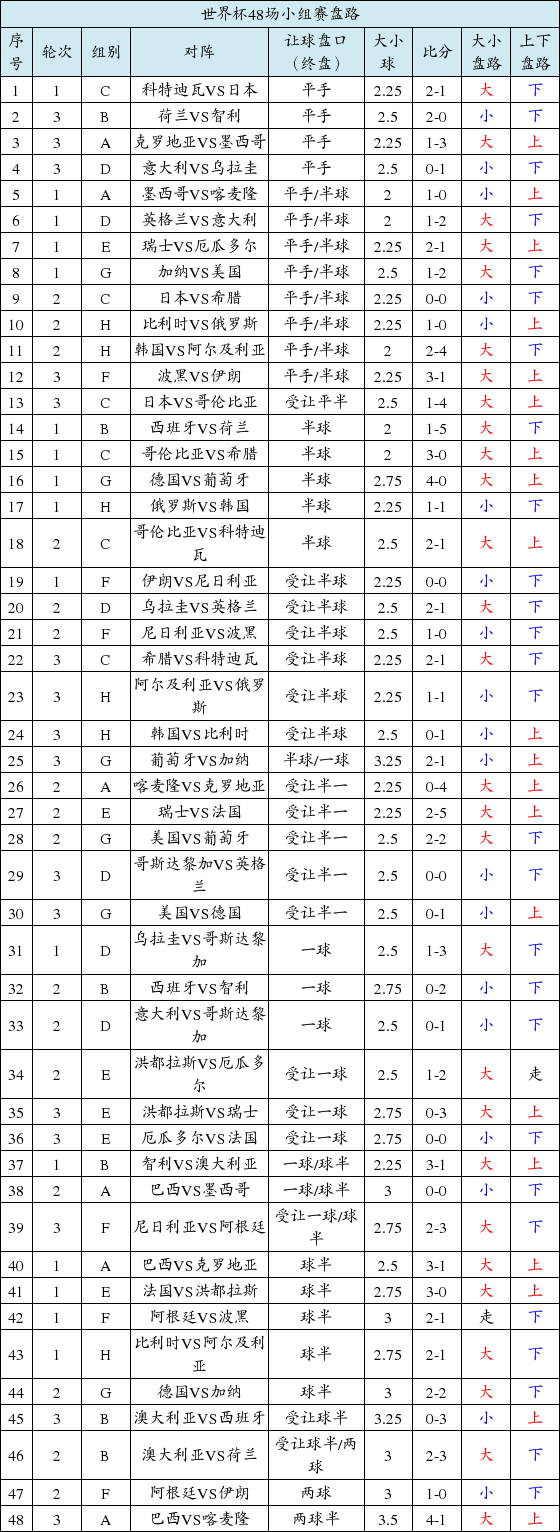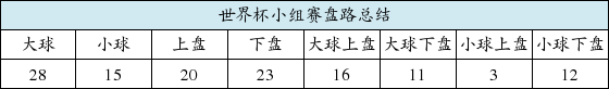 揭幕战为本届世界杯开了个好头,各队大打攻势足球,48场比赛场均进球接近3个。小组赛阶段总计打出28场大球比分,小球19场,大球占比将近2/3。各队状态实力越发接近,造成小组赛上下盘开出比例相当,上盘23场,下盘24场。大球场次的上下盘比为16:11,小球场次的上下盘比更是倾斜为6:13,可见小组赛阶段让球一方的赢盘能力极其脆弱,尤其是打出小球比分的场次基本上都以下盘为主。