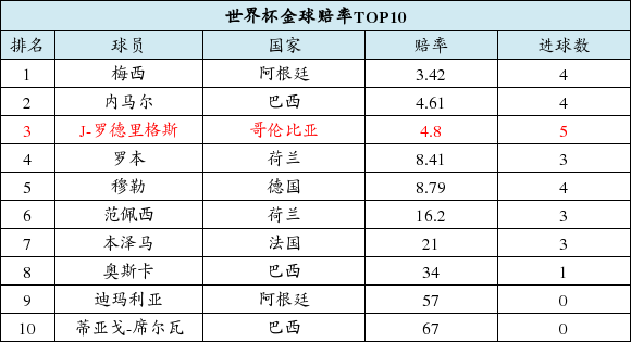 梅西自世界杯开赛以来,多数时间占据金球榜的榜首位置,这是博彩公司对梅天王发挥的期待以及对阿根廷实力可以走的更远的肯定。这在金靴榜上也可以看出一二,虽然J罗以5球独自领跑,但是仍然被进4球的梅西压制,但是他也成功跻身了前三名。从远远被甩在身后到迎头赶上,J罗只需要一战,神锋的潜力不可估量!