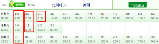 比利时中前场不乏天才球员,只是在世界杯的大舞台上,这批年轻人的配合略显稚嫩。比利时小组赛一场2比1、两场1比0,进攻端的表现并不稳定,因此竞彩官方开出的比分赔率中,比利时1比0胜的赔率仍是最低的4.8,2比0则上升到7.0。而美国除了1比0的赔率为1比8略微偏低外,2比1和2比0等比分的赔率全都突然高企,美国打入两球已非常不被看好。