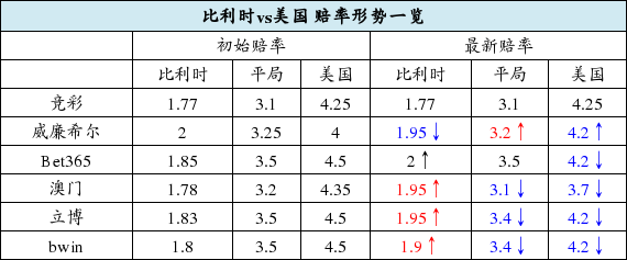 本场bet365和bwin等初盘都都是开出1-3-4组合,颇为关注比利时杀入8强。不过几家主流公司的最新赔率中,仅有威廉希尔降低比利时胜赔,其余都是降低美国胜赔。澳彩更是将比利时胜赔由1.78调高到1.95,显示出对比利时的担忧。比利时最大的问题在于缺乏流畅进攻,而美国虽然整体实力不如对手,但是占据了不错的地利优势,这应该是本场赔率发生变化的主因。