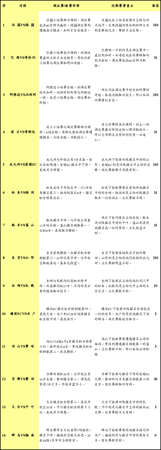 本期足彩总体赛程形势:本期足彩是以巴西世界杯1/4决赛4场和一轮日乙联赛为竞猜对象。4场淘汰赛中,根据对阵双方在小组赛与淘汰赛上的表现做出评估,比如相比之下德国的消耗明显强于法国,所以这场比赛首看法国不败,但考虑到两队之间的实力还是略有差距,因此全包。巴西同样在淘汰赛遭遇阻击,而哥伦比亚却是4战全胜,消耗相对较小,但考虑到巴西东道主身份,所以其90分钟内输球的可能性较低,建议双选31。阿根廷与比利时均在淘汰赛中,经历了加时赛的考验,两队消耗均较大,因而建议全包。荷兰小组赛3战全胜,淘汰赛也在90分钟内获胜,但其与墨西哥一战消耗极大,最后时刻的逆转更是对心理和身体的双重冲击,所以这场比赛有必要防冷。(北单王者)