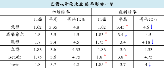 形势:巴西胜赔略升 哥伦比亚攻防俱佳