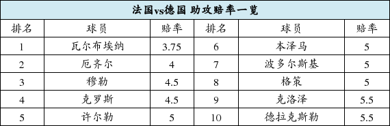 本场比赛球星云集,而名气最大的中场传球大师,几乎全都在德国阵中。然而在助攻赔率榜上,厄齐尔1比4的进球赔率只能排在第二,压倒“小媳妇”排名第一的是法国“矮脚虎”瓦尔布埃纳,他的助攻赔率为3.75。此人助攻赔率力压德国三大中场厄齐尔、格策和克鲁斯,确实让人颇为意外。