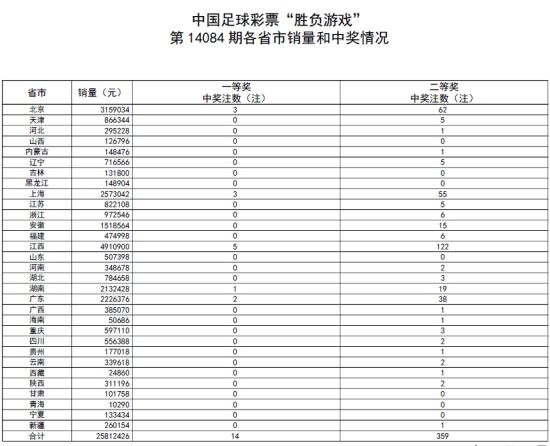 北京时间2014年7月5日,胜负彩14084期开奖揭晓,结果头奖爆出14注128万,新浪购彩平台独揽3注。二等奖359注13804元,销量为2581万。任九中出1943注5177元,销量为1571万。