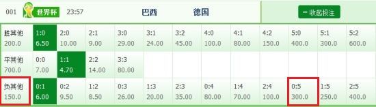 竞彩比分投注中,0-5的选项也已是极限。但德国仍然不留情面,7-1的比分径直的打穿了投注范围。就连赔率都要兜不住了。上半场结束时,比分定格在0-5,对照赛前赔率,这个比分的赔率已经高达1赔300,但即便这样还是无力阻止德国的脚步。