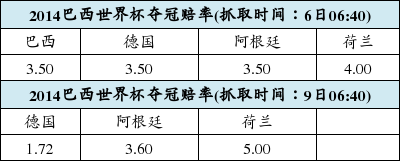 北京时间7月9日6:00,德国7-1大胜巴西,率先挺进2014年世界杯决赛。如此强劲的表现也让德国的夺冠赔率由赛前的3.50降为1.72,强势出击的德国战车已然霸气外露。荷兰的夺冠赔率由此前的4.00上升到5.00,看来相比于德国人,荷兰更愿意碰上巴西队。阿根廷的夺冠赔率小幅上涨0.1,表现比较淡定。