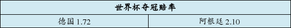 北京时间7月10日凌晨,阿根廷点球击败荷兰晋级世界杯决赛。争冠队伍终于只剩下两支球队!最新夺冠赔率显示,刚刚7-1狂胜东道主的德国依旧强势,冠军赔率为1.72。阿根廷稍显劣势。