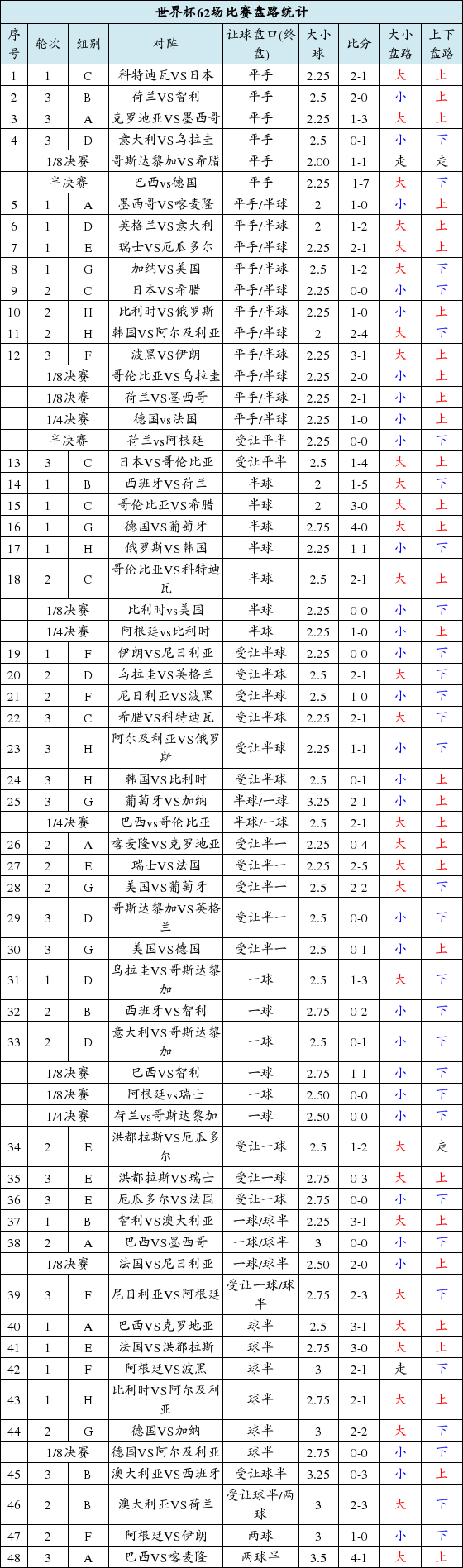2014年巴西世界杯已进入尾声,新浪彩票将从比赛盘路的角度带您回顾过去一个月的62场比赛。在已结束的62场比赛中,上盘30场,下盘30场,走盘2场。大小球方面,大球打出30次,小球打出30次,走盘2次。