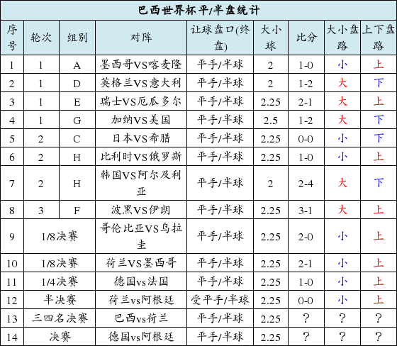 北京时间2014年7月13日凌晨及14日凌晨,世界杯三四名决赛以及决赛将展开争夺。而目前博彩公司开出两场比赛均为平/半盘(巴西、德国为让球方)。而本届世界杯此前所开出的平/半盘中,走势又如何呢?