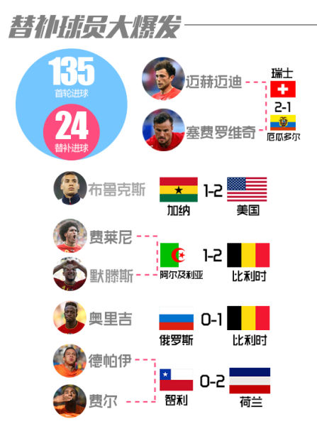 世界杯小组赛中替补球员发挥了非常关键的作用,小组赛首轮瑞士和厄瓜多尔队的比赛中下半场替补登场的迈赫迈迪和塞弗洛维奇分别帮助球队扳平和反超比分,拿到出线道路上关键的三分。美国和加纳队的比赛中美国队替补布鲁斯下半场86分钟进球,成功帮助球队战胜对手。而欧洲红魔比利时队小组赛前两轮依靠替补球员的三粒进球,拿到6分成功从小组中出线。荷兰队也在和智利队小组头名之争中凭借两名替补登场的球员打开胜利之门。在世界杯小组赛135粒进球中,替补登场的球员打进了24粒,这一比例还是非常的高的。