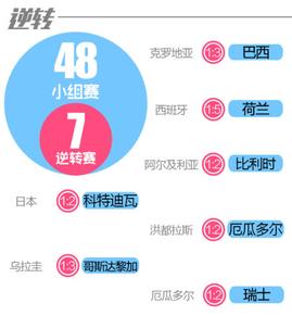 小组赛首轮比赛中,有6支球队在比赛中先取得了进球,但是最终却没有将优势保持到终场。南美劲旅厄瓜多尔队最后一分钟被瑞士队绝杀,而这场失利也使得他们成为了唯一一支没有从小组中出线的南美球队。“蓝武士”日本队2分钟之内被科特迪瓦连进两球,惨遭逆转,赛前被寄予厚望的日本队在后两场比赛中1平1负,惨遭淘汰。卫冕冠军西班牙首轮比赛1:5惨败荷兰,他们同样是再先进1球的情况下被逆转,而这场失利对球队的信心有着极大的打击,最终三战仅胜1场,小组赛即遭淘汰。上届世界杯第四名乌拉圭首轮在领先的情况下被黑马哥斯达黎加队逆转,不过在后两轮比赛中他们连克英格兰,意大利成功的从小组赛中突围。而世界杯后两轮比赛中仅在第二轮赛事中出线了一场逆转,便是厄瓜多尔队2:1反败为胜战胜了洪都拉斯,由此可见在首轮过后,各种球队在场上踢的更加谨慎,领先之后踢的更加小心稳妥。