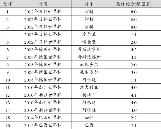 克洛泽4届世界杯16球全记录 2014-07-09 04:38 新浪体育 12766 您的浏览器不支持video标签。 如果无法观看,请点击这里刷新播放 视频下载 浏览原图克洛泽打入个人世界杯第16球 德国对阵巴西上半场还未结束,日耳曼战车已经5-0领先。比赛进行到第22分钟,克洛泽连续两脚射门终于破门,以16粒入球成为了世界杯史上进球最多的球员,德国队摧枯拉朽,K神的世界杯传奇还在延续! 以下是克洛泽世界杯进球全记录 >>>高清图回顾克洛泽世界杯15球 相关: 世界杯史上第一射手 克洛泽16球超越罗纳尔多 天意!克洛泽踩着巴西超越罗纳尔多 这一刻天注定 德国打疯了!7分钟灌巴西4球 29分钟5比0谁能想到 浏览原图