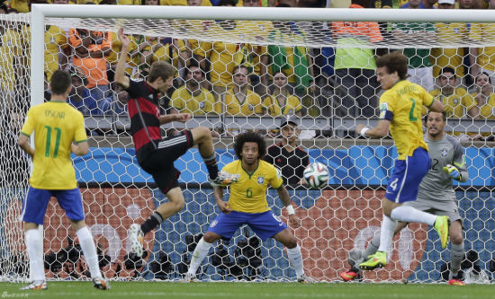 今天的比赛,穆勒为德国队打开了胜利之门。比赛第11分钟,克罗斯右侧开出角球,嗅觉灵敏的穆勒出现在了他应该出现的位置上,他的凌空推射令巴西门将塞萨尔猝不及防,皮球从塞萨尔的左腋下入网,场上的僵局由此被打破。除了进球以外,穆勒还为队友送出了助攻。那是在巴西队的伤口上撒盐的第7粒进球。比赛第80分钟,德国队长传左路,穆勒快速起动,在皮球即将出底线之前将球勾回,跟进的许尔勒在禁区内停球后凌空抽射,将比分变成了7-0。[登顶?投德国夺冠1赔1.48]