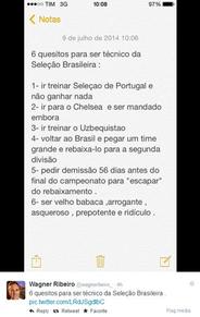 里贝罗在他的推文中,将斯科拉里职业生涯的失败经历几乎一一列出,并用“成为巴西队主教练的6个必要条件”为题,对斯科拉里进行了挖苦。
