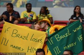 在今天加林查球场的看台上,一对激吻中的情侣的出现吸引了全世界的目光。轻轻侧身,双唇相贴,他们的世界仿佛在这一刻停止了,沉浸在满满的幸福之中。有趣的是,二人分别用代表巴西的黄绿色横幅向对方写出了自己的心声。女孩写道:“如果巴西队输球,我就嫁给他”;男孩则写道:“如果巴西队赢球,我就娶了她”。其实,这一刻球队或输或赢已经不重要了,重要的是他们决定今生输赢都要在一起!