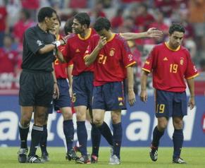 过了意大利,还有西班牙,这场主场哨,事实上比对意大利时要还过分,明摆着就是不让西班牙人进球。下半场第50分钟,韩国队的金泰映乌龙头球被判无效,从慢镜来看,谈不上有人恶意冲撞金泰映。接着在加时赛第2分钟,华金助攻莫伦特斯头攻破门,又被甘杜尔联合特立尼达和多巴哥的边裁判罚为出界,但慢镜再次证明判罚为错判。当加时赛打到119分钟西班牙队准备罚角球时,甘杜尔索性提前结束了比赛。这场球,西班牙媒体如何反应可想而知,就连朴智星赛后都承认裁判的判罚值得商榷。