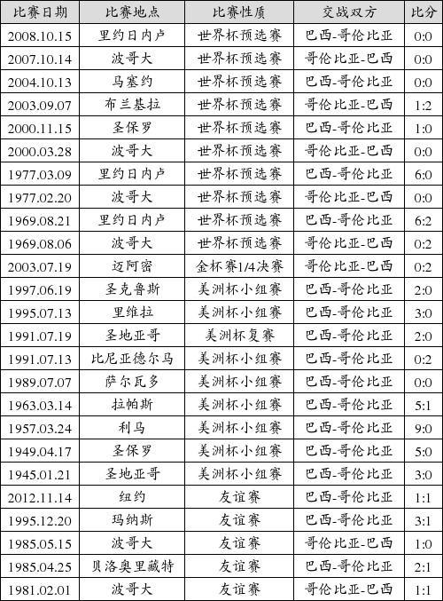 两队在历史上交战过25场,巴西队15胜8平2负占据绝对优势,进55球失11球。两队在世界杯历史上无交锋战绩。两队在世界杯预选赛中交战过10场,巴西队5胜5平保持不败战绩完全占据优势,进17球失3球。两队在美洲杯历史上交战过10场,巴西队8胜1平1负占据绝对优势,进31球失3球。两队在友谊赛历史上交战过5场,巴西队2胜2平1负稍占上风,进7球失5球。