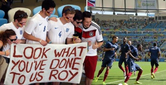 就在两队热身的时候,一群身穿三狮军团球衣的球迷吸引了摄影师的注意。他们用白底红字的横幅打出上写“霍奇森,看看你对我们做了什么”的标语,发泄着对三狮军团早早出局的强烈不满。有趣的是,他们似乎加入了宿敌德国队球迷的一方,正在和两位德国支持者开心合影。看来,英格兰不争气,这些英伦球迷只能出此下策了。