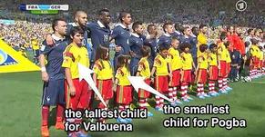 昨天,身高1米63的法国中场巴尔武埃纳对德国比赛时进场就领了一位身材最高的小球童,而德国队中身材最矮的队长拉姆(1米69)也给配了一名最高的小球童。转眼到今天,轮到梅西出场,他领的小球童呢? 简直就是一个豆丁,个头才到梅西的腰部。也难怪有网友开玩笑地道“国际足联这真是父爱如山啊!”