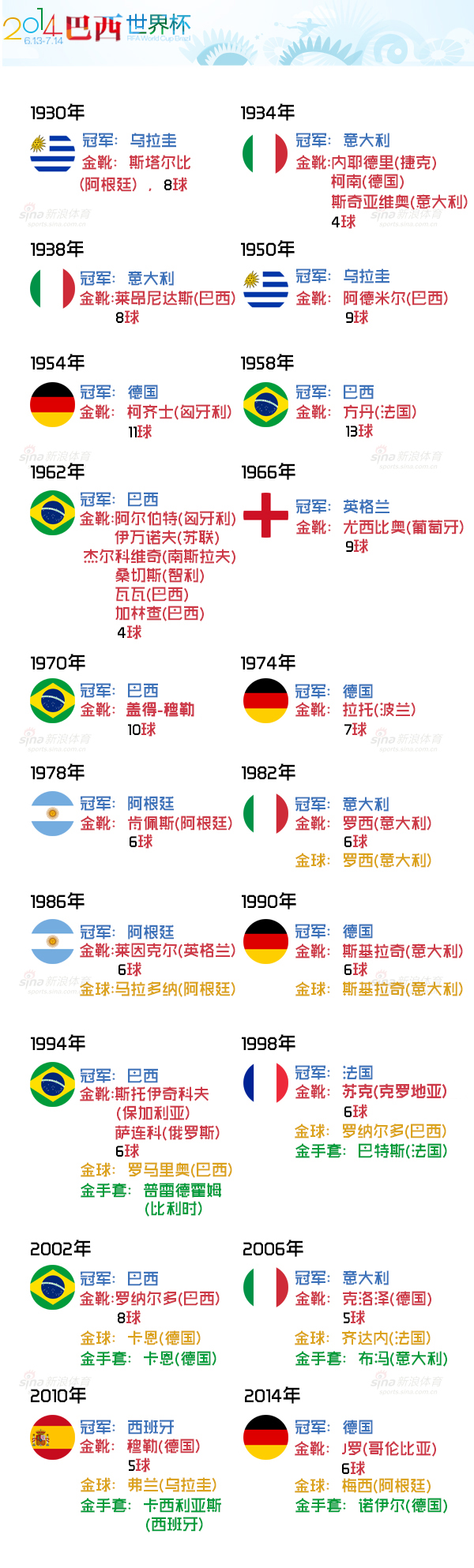 巴西世界杯落下帷幕,德国队加时赛1-0击败阿根廷夺冠,历史上第四次登顶。梅西虽然未带领阿根廷夺冠,可他还是荣膺金球奖,上次阿根廷人拿到这一荣誉是1986年的马拉多纳,不同的是那次阿根廷夺冠。哥伦比亚射手哈梅斯-罗德里格斯以6球荣膺金靴,打破连续两届世界杯金靴只有5球的纪录。诺伊尔拿到金手套奖,这是德国队史上的第二次,上次是2002年的卡恩,当时德国队0-2输给巴西屈居亚军。法国93年新星博格巴则当选最佳新秀。值得注意的是,世界杯金球奖1982年设立以来,连续5届得主是非冠军队成员,9次里只有3次归属冠军队,分别是1982年的罗西、1986年的马拉多纳和1994年的罗马里奥。