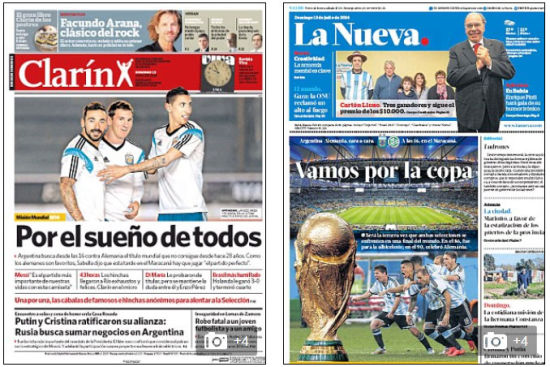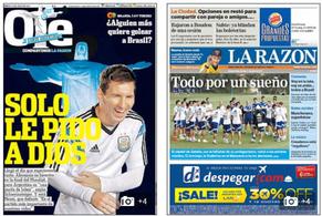《La Razon》报头版放了阿根廷队最后一次训练的照片,标题是“一切为了梦想”。阿根廷《号角报》也以“所有梦想”为头版标题,期待阿根廷队在巴西捧起冠军奖杯。《La Nueva》报更加则鼓舞人心,他们的头版标题是“我们为奖杯而战”。(gogo)
