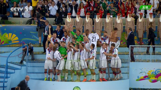 凭借着格策在加时赛几乎是最后时刻的绝杀进球,德国人击败了由梅西领衔的阿根廷队,依靠强大的团队最终登上了世界之巅,第四次在世界杯赛上封王。比赛结束之后,身着“四星德国”队服的日耳曼众将士们登上了本届世界杯最高的领奖台。