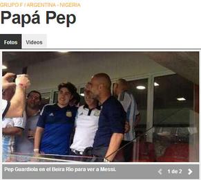 不过,球迷虽然未能在现场看到马拉多纳,还是见到了足坛另一位巨匠瓜迪奥拉。阿根廷对尼日利亚之战,瓜迪奥拉是场外的焦点。有人猜测瓜迪奥拉看阿根廷比赛,是为了拉梅西到拜仁慕尼黑,但并非如此。拜仁慕尼黑主帅是利用到阿根廷举办讲座的机会,前往巴西观看世界杯的比赛。在能看的比赛中,他最终选择了阿根廷对尼日利亚的这一场。《每日体育报》称,瓜帅之所以选择看这一场,显然是因为对昔日的弟子梅西念念不忘,而阿根廷队内还有马斯切拉诺这样的前弟子。
