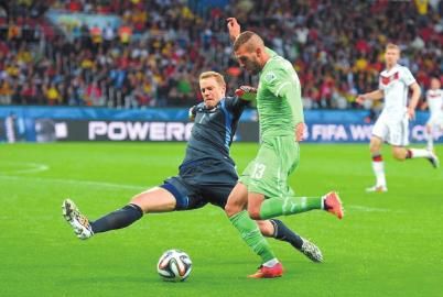 与阿尔及利亚一战,诺伊尔高接抵挡,数次冲出禁区,飞身滑铲、头球解围……将对手有威胁的进攻一一化解,堪称德国队的第五后卫。在世界杯淘汰赛这样的重要场合,之前从未有门将如此大范围、密集甚至是肆无忌惮地在禁区外活动,并以后卫的方式铲球和头球解围。