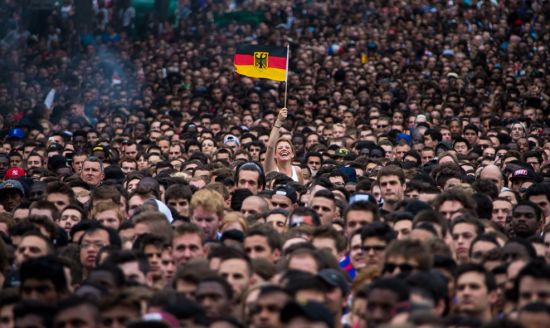 双方比赛时,在巴黎市政厅广场前有密密麻麻近万人驻足观看大屏幕直播,他们大都身着法国队球衣,挥舞着蓝白红三色旗,这时一名德国女球迷在人丛之中突然跳起,举起手中的德国政府旗,一种虽万千人吾往矣的气势也这样被记录在摄影师的镜头之中。